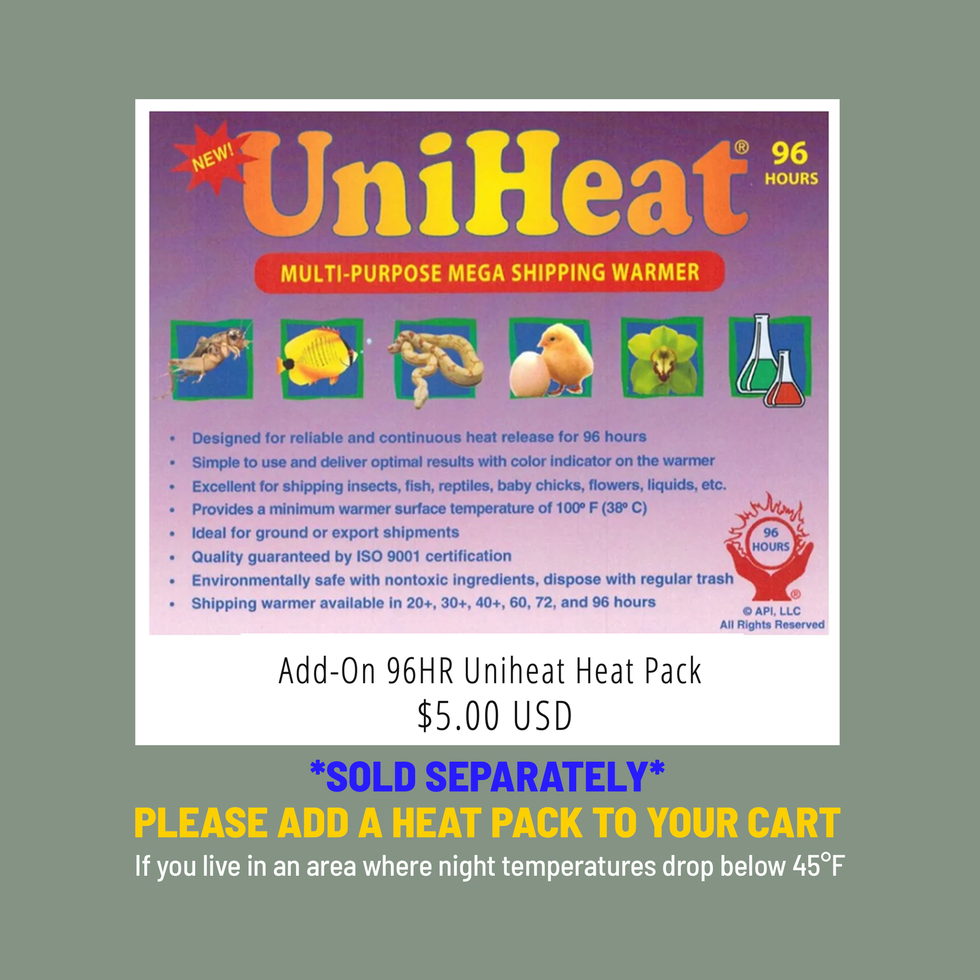 - A $5 ‘96 Uniheat Heat Pack’ is available for purchase separately. If you live in an area where night temperatures drop below 45°F, please ensure that you add a heat pack to your cart before checking out. The heat pack is essential to protect your order during cold weather transit. Please note that it is your responsibility to include a heat pack if you're in a colder region. We are not liable for any cold-related damage to your order if a heat pack is not included.